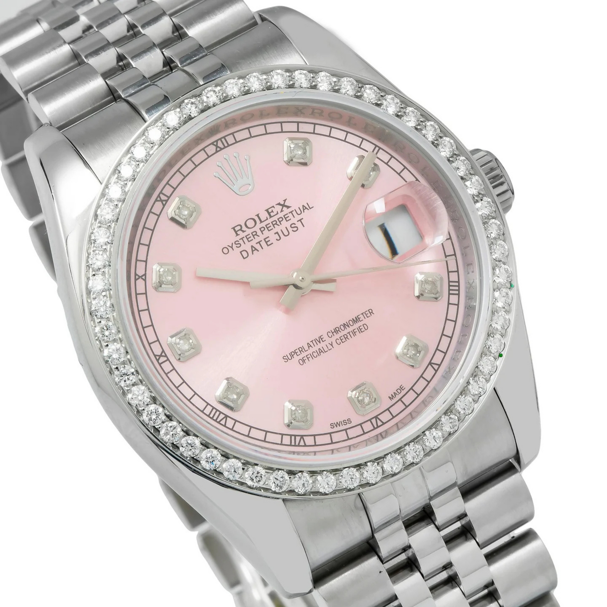 Crafted from Rolex’s signature Oystersteel and crowned with a brilliant diamond-set bezel, this timepiece merges durability with radiance. Inside, the advanced Caliber 2236 automatic movement delivers precision timekeeping with a 55-hour power reserve and enhanced shock resistance. The Oyster bracelet completes the piece with sleek, tapered lines and everyday comfort, making this Datejust an ideal companion for both casual elegance and formal sophistication.