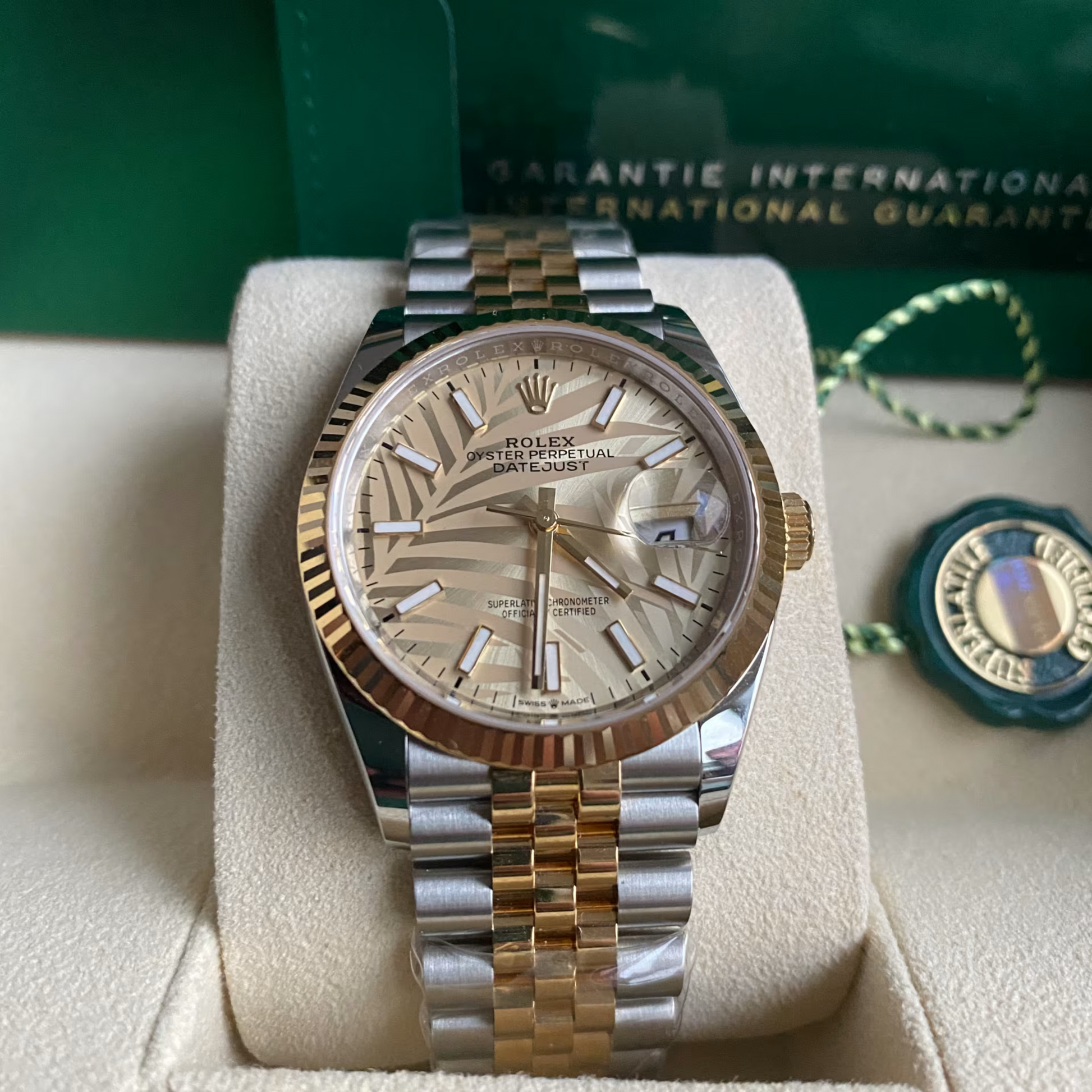 Refined yet distinctively bold, the Rolex Datejust 36 (Ref. 126233) captures the spirit of modern luxury with its rare and eye-catching golden palm motif dial. This unique design, set against a warm champagne backdrop, is enhanced by luminous baton hour markers and polished hands—offering a tropical twist on a timeless classic. The date window at 3 o’clock, magnified by the Cyclops lens, ensures daily functionality with unmistakable Rolex charm.